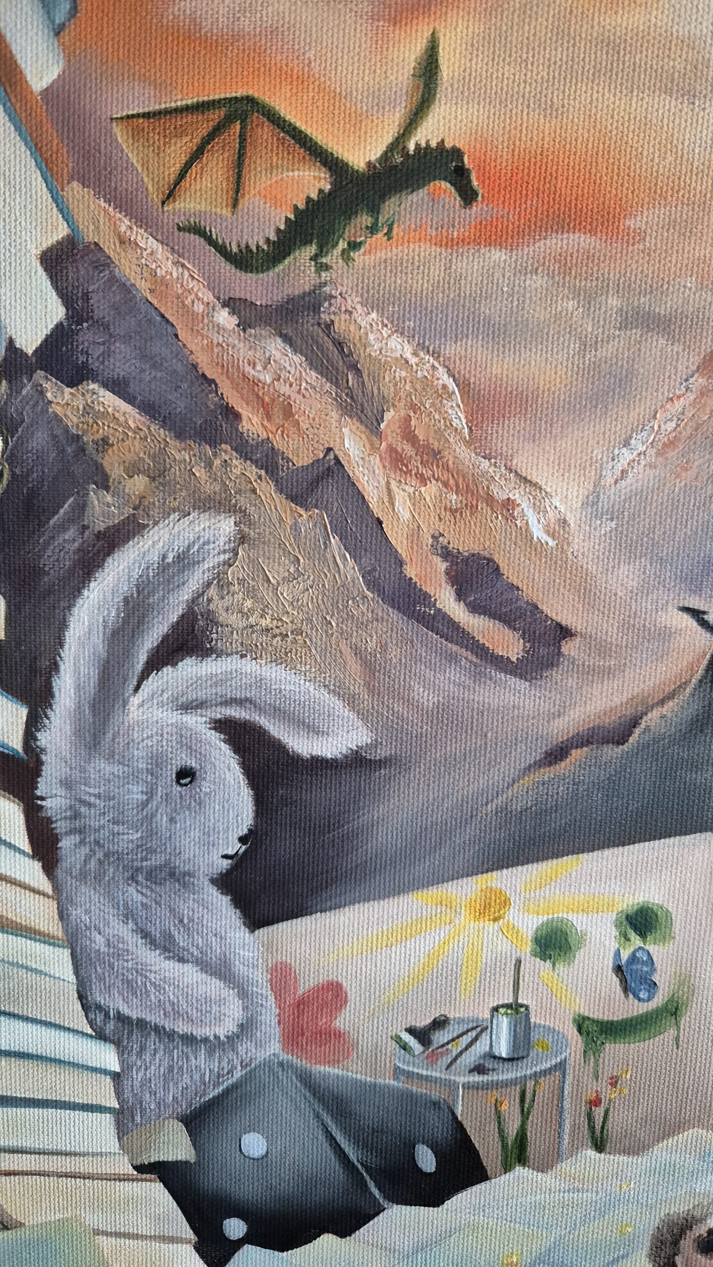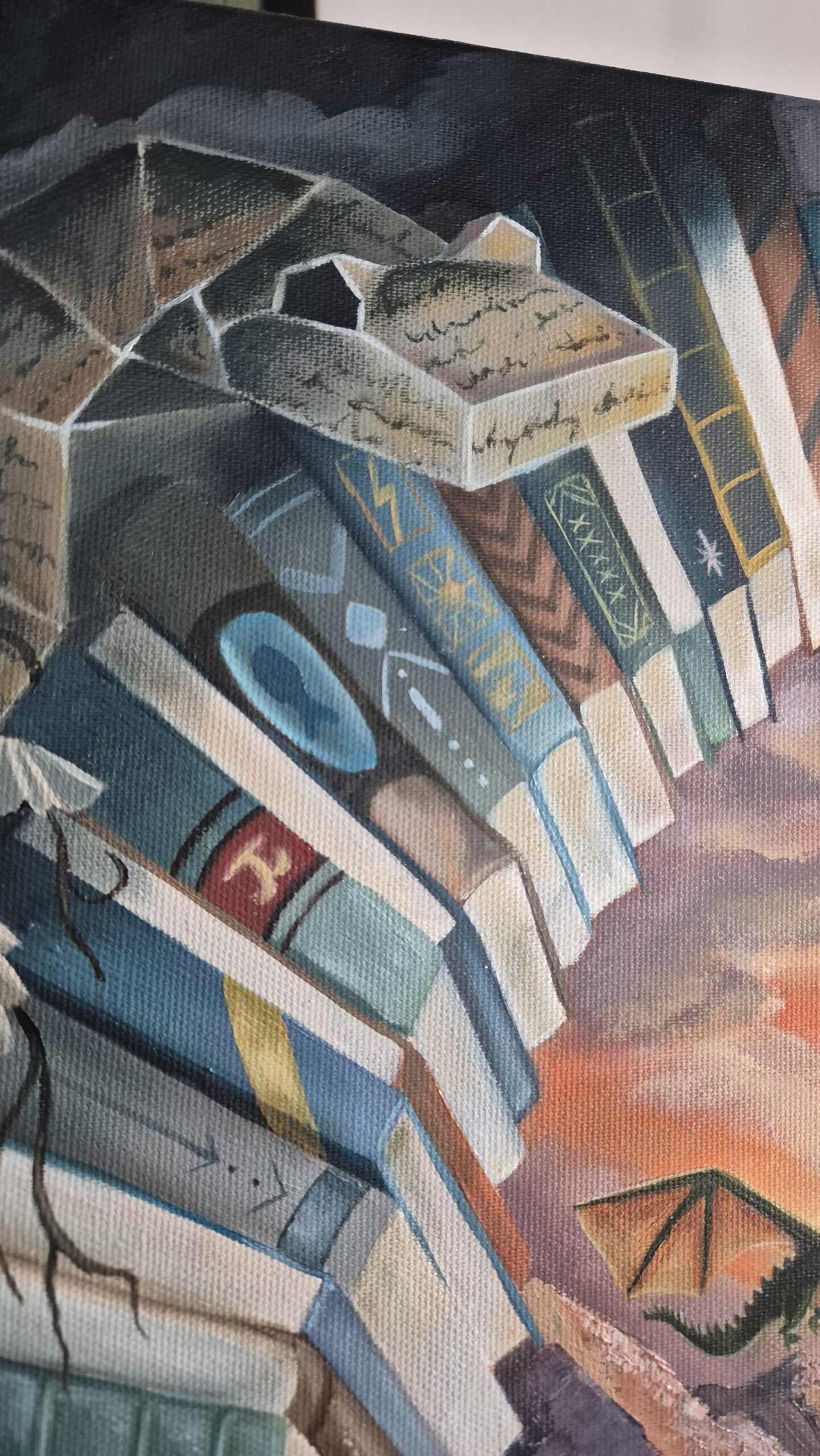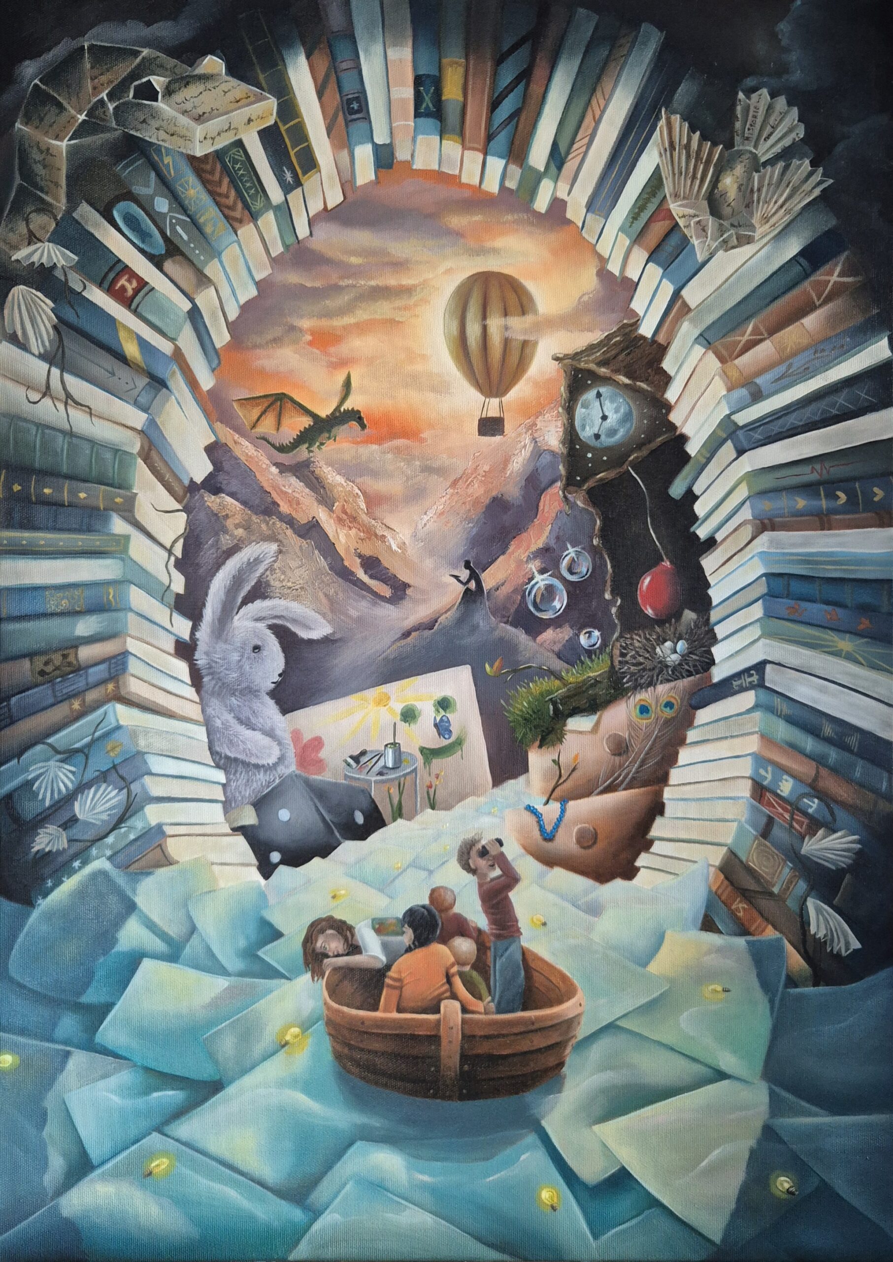 Men maleriet er i bogstaveligste forstand en portal af bøger, en flod af historier tager dig ind af åbningen på nye eventyr.