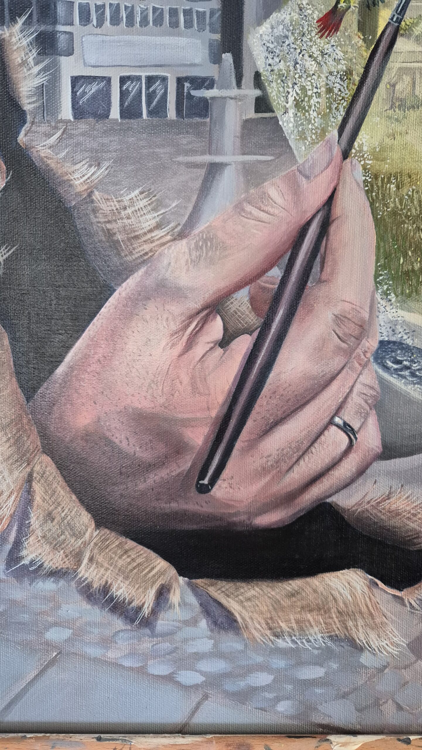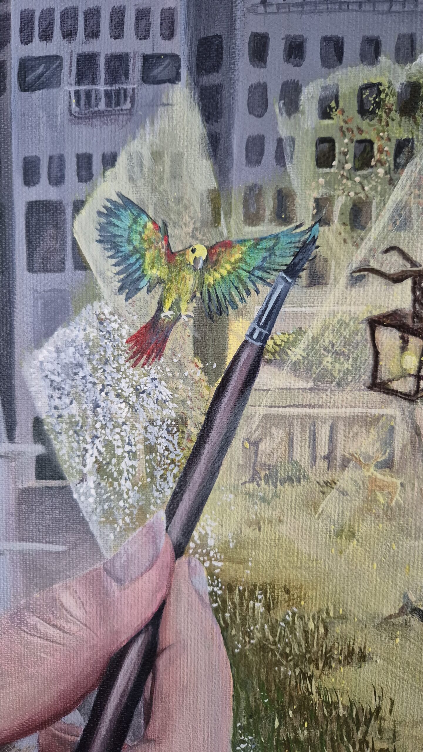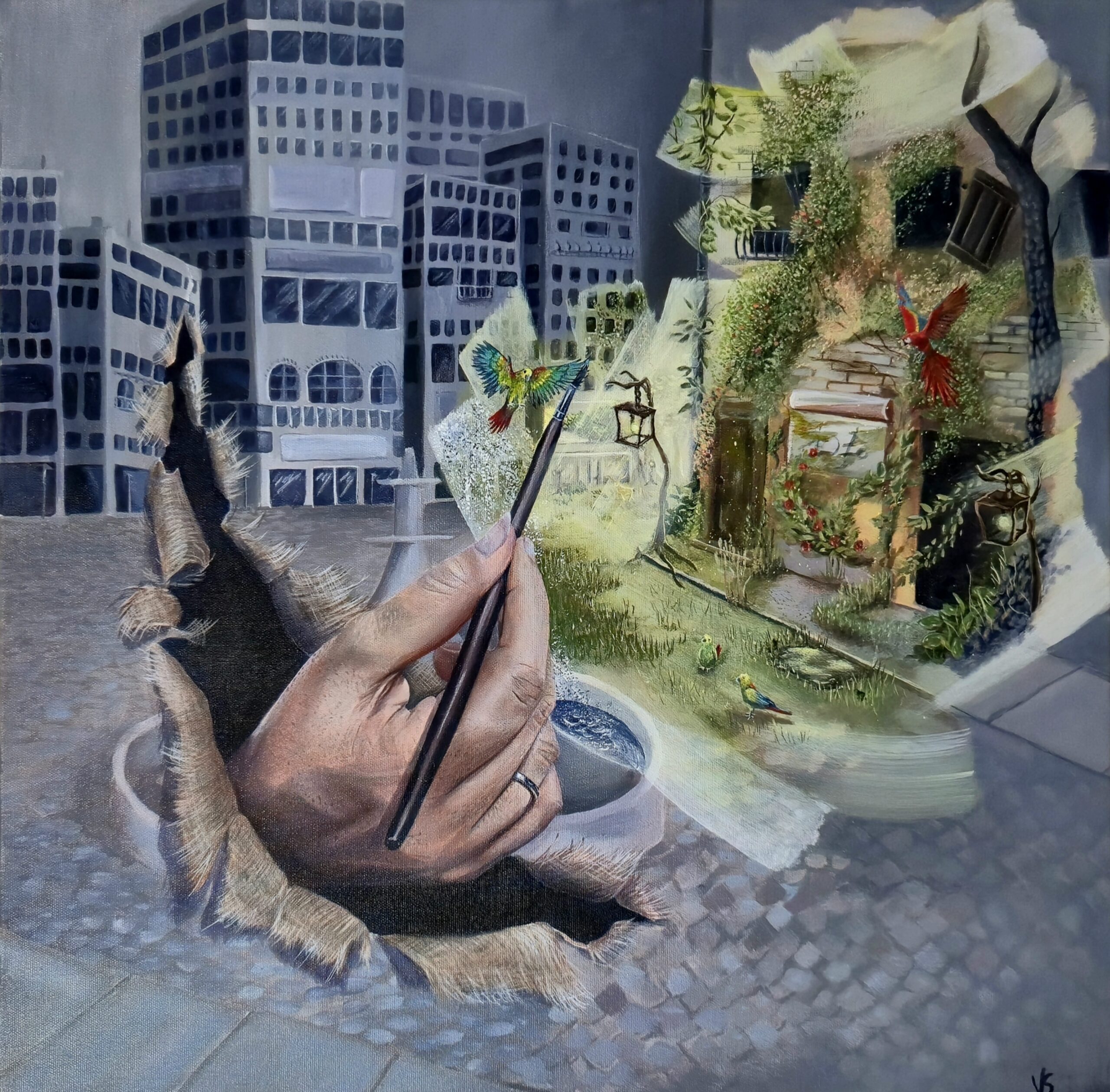 Ind igennem lærredet kommer den kreative hånd og sætter kulør på den grå og kedelige hverdag. Jeg elsker ud af lærredet temaet, og jeg er virkelig glad for hvordan dette maleri er blevet. Materialer Akryl på Lærred Størrelse 50x50cm Pris 2500,-