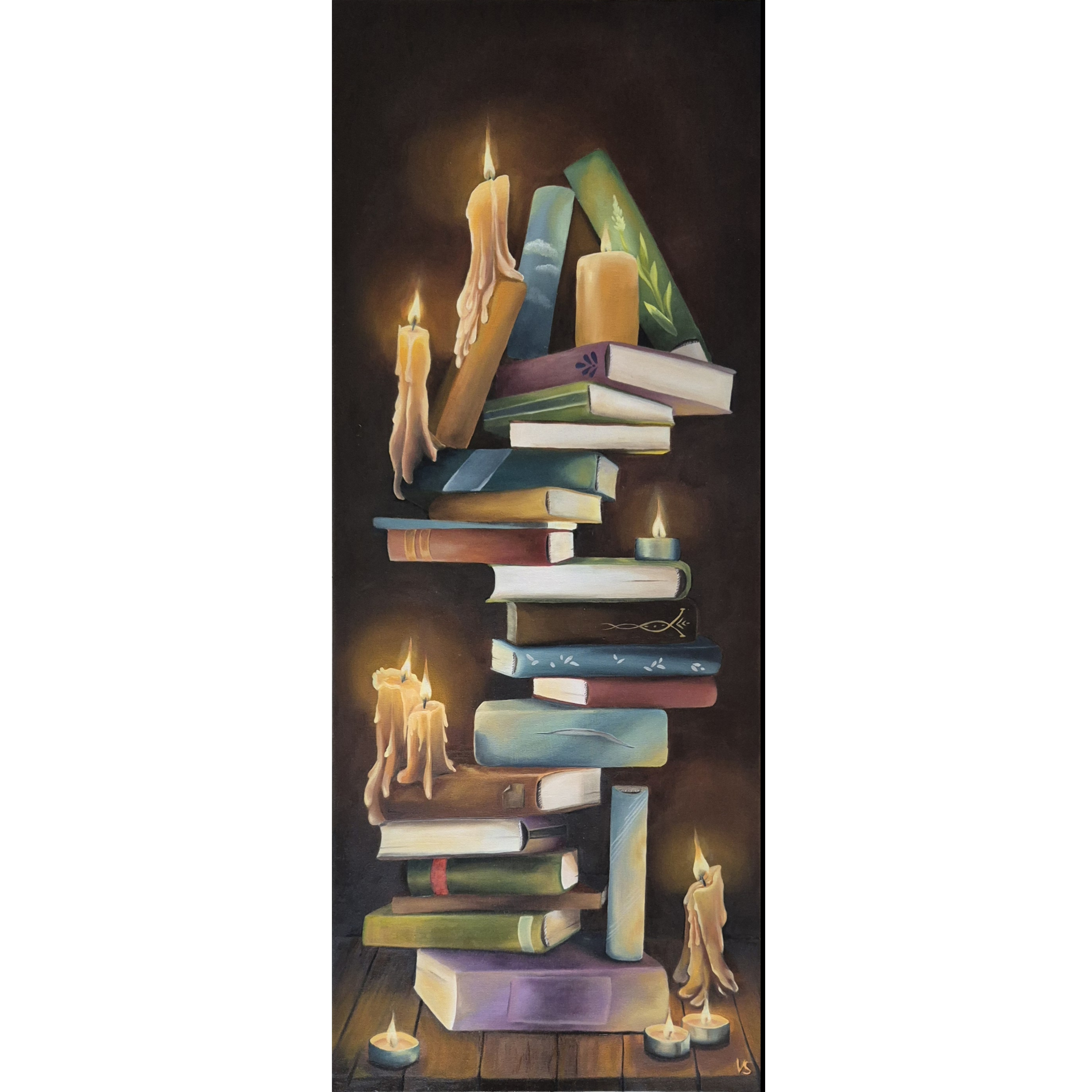Jeg fik lyst til at øve mig i belysning, og hvad er bedre at øve på end bøger og stearinlys!Jeg synes selv at det er så rart et billede, og så er det smalt og højt, så det passer ind næsten overalt! Materialer Akryl og olie på opspændt lærrede Størrelse 40x100cm Pris Solgt